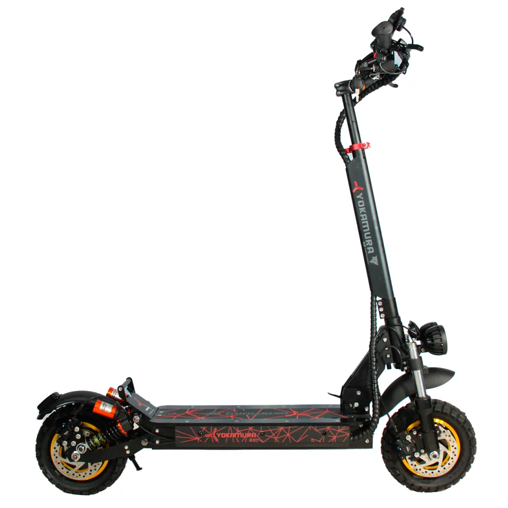 Самокат YOKAMURA RX1 на одном заряде аккумулятора преодолевает расстояние 60 км. Дисковая тормозная система на переднем и заднем колесе позволяет совершать маневры, амортизация делает движение электросамоката плавным даже на не ровной дороге. Производитель предусмотрел внешнее освещение для передвижения в темное время суток.